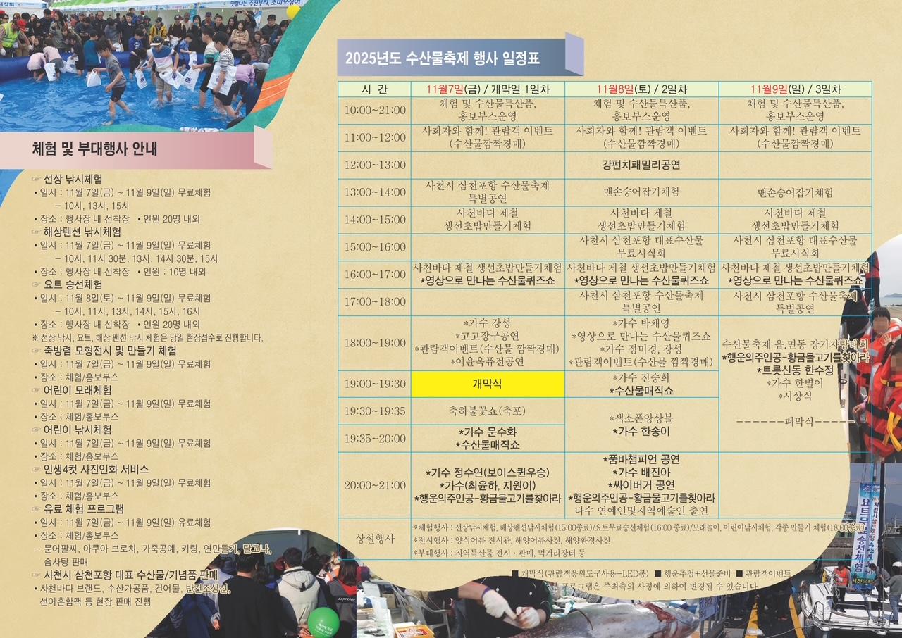 사천시 삼천포항 수산물축제는 사천시의 청정 해역에서 갓 잡은 신선한 수산물을 중심으로, 아름다운 항구 풍경과 함께 즐기는 대표적인 가을 해양축제입니다. 현장에서는 지역 수산물 직거래는 물론이고 사천시 삼천포항 대표수산물 무료시식회, 맨손숭어잡기, 각종 체험 프로그램, 불꽃쇼 및 공연 등 다채로운 이벤트로 방문객에게 ‘바다의 맛’과 ‘바다의 즐거움’을 함께 선사합니다.